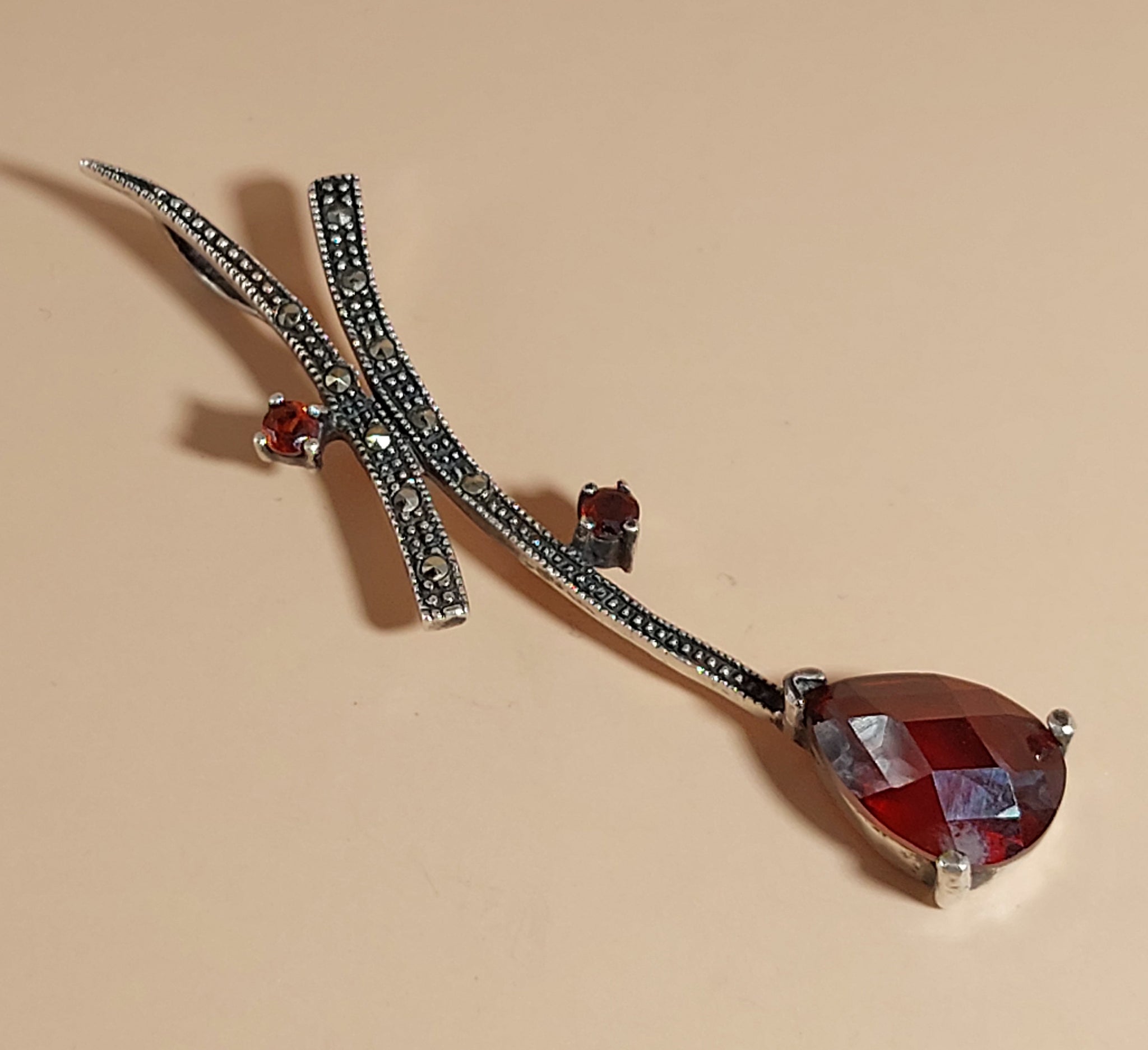 SILVER MEDALLION SMALL MARCASITES STONES , A TEAR GENUINE GRANATE IN DARK CHERRY COLOUR, 2 SMALL ROUND MARCASITES